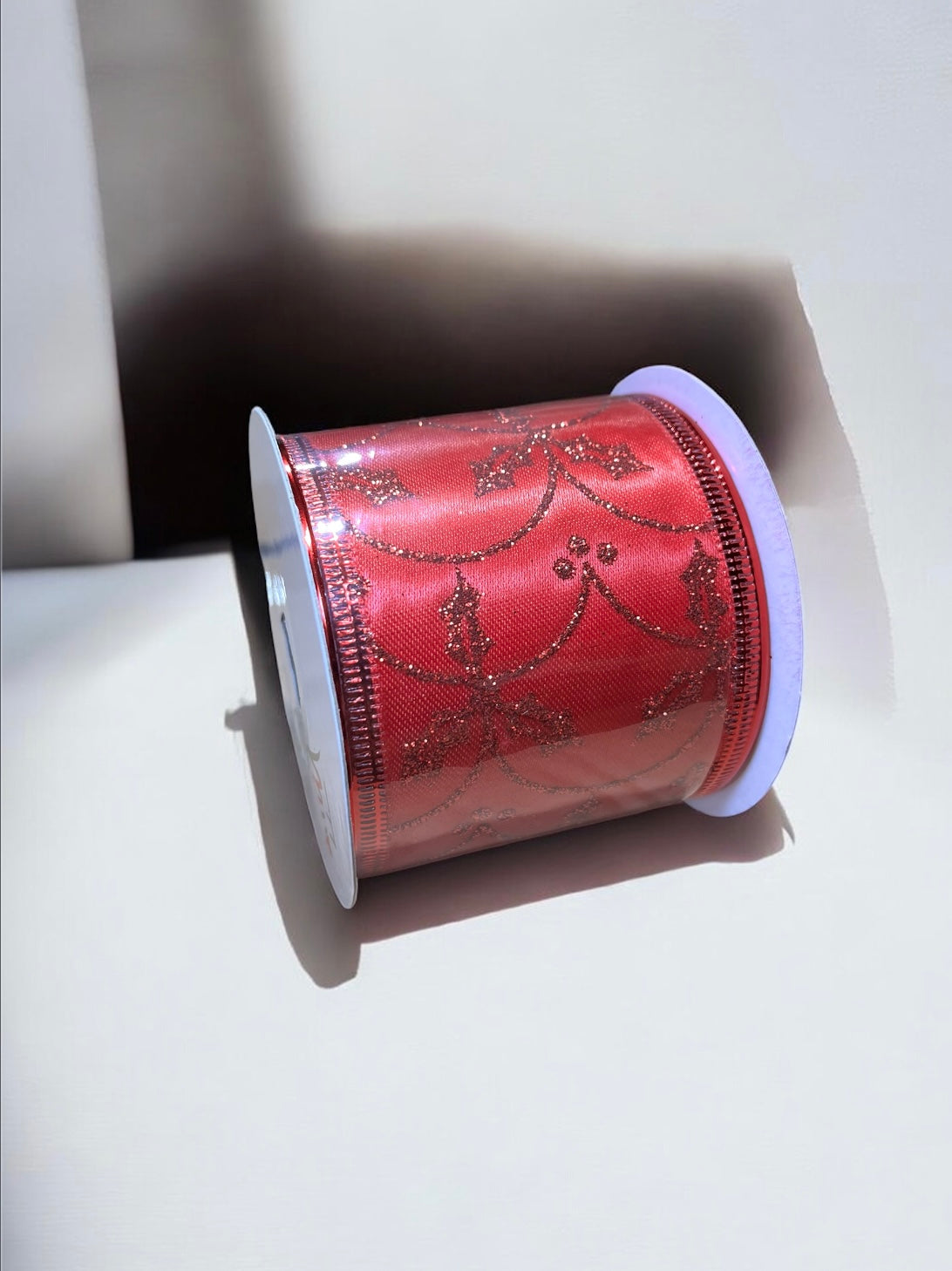 Cinta navideña alambrada roja con grabado de hojas 6.5cm x 9.15m (TCH01801RR)