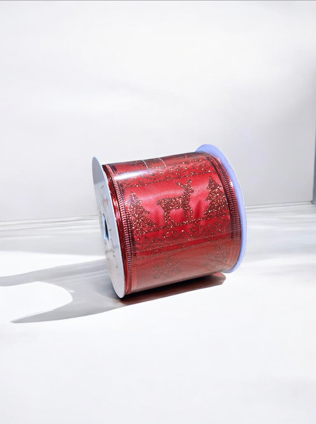 Cinta navideña alambrada roja con grabado de renos y árboles 6.5cm x 9.15m (TCH01798RR)