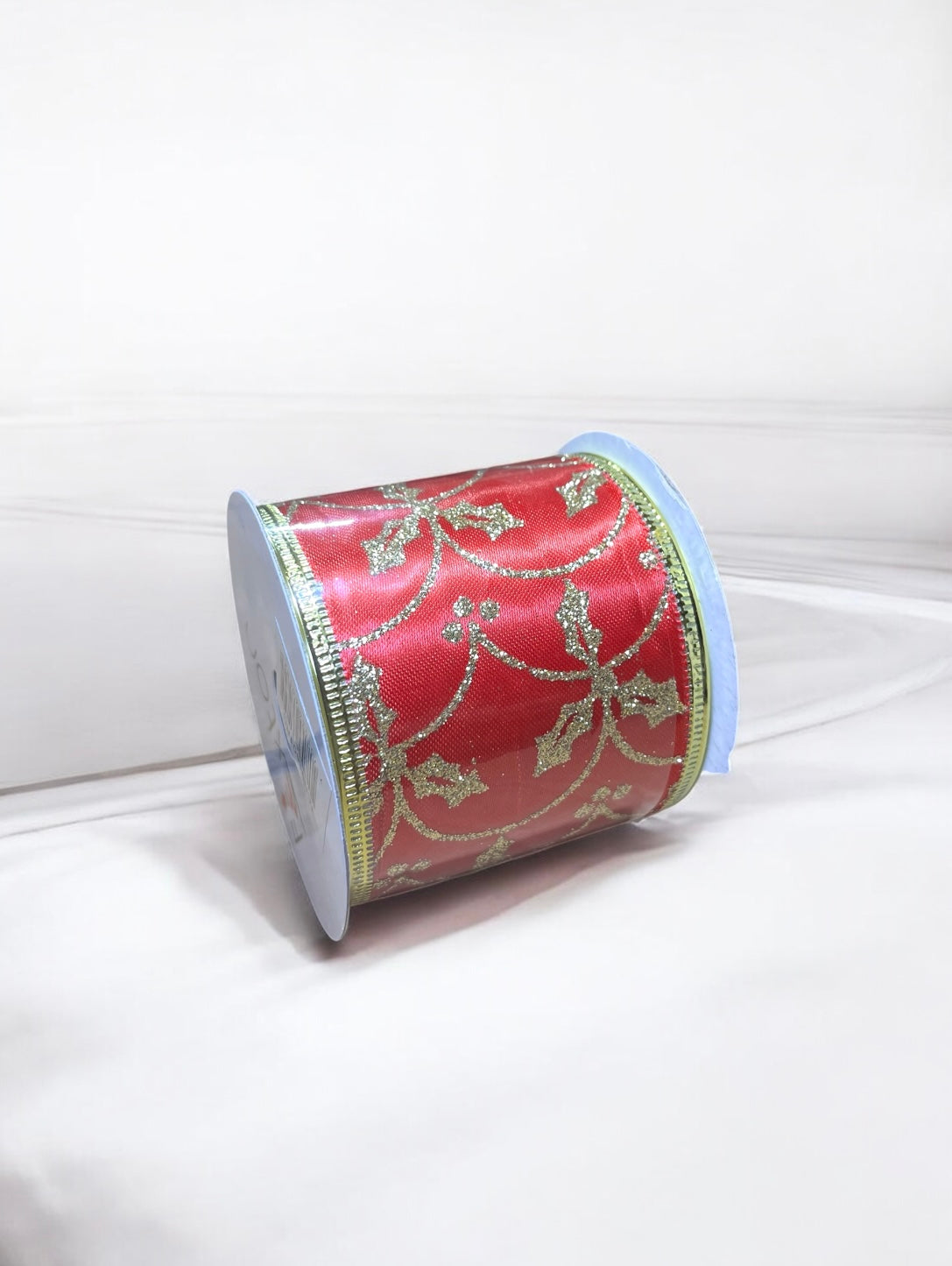 Cinta navideña alambrada roja x dorada con grabado de hojas 6.5cm x 9.15m (TCH01801RG)